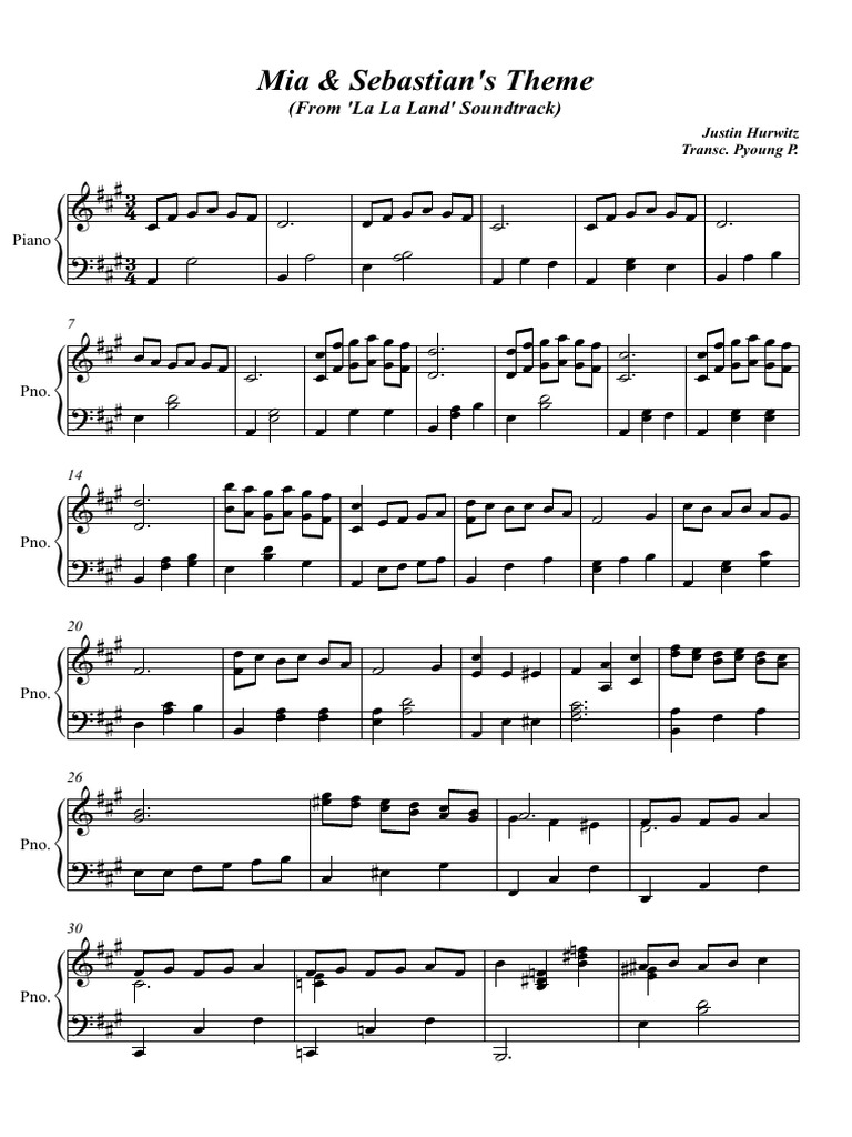 Ko je film Dežela La La dokončno dobil zeleno luč, sta se ga Chazelle in Hurwitz lotila precej sistematično. Prva naloga, ki jo je skladatelj dobil od režiserja, je bil izziv, naj ustvari glavno glasbeno témo filma. Hurwitz je cele dneve presedel pred klavirjem in preigraval idejo za idejo. Ko pa je vendarle prišel do prave melodije, je bil to zanj in za Chazella “odločilni trenutek. Rekla sva si, okej, uau, to je téma filma.” Omenjena glavna téma je napisana v dveh zelo podobnih variacijah, ki se razlikujeta v tonaliteti in taktovskem načinu (no, pa tudi v naslovu). Oglejmo si njuna odlomka pobliže oz. v klavirskem notnem zapisu: